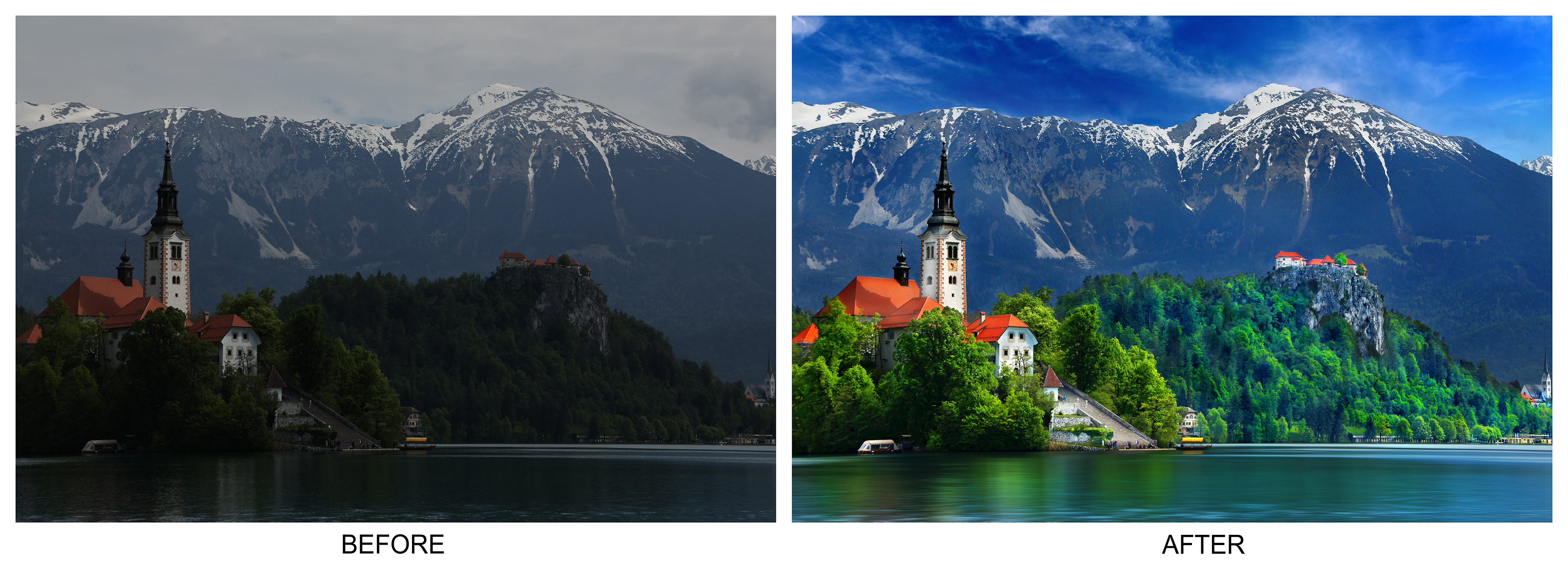 Lake Bled in Slovenia. The day I took this photo it was very dull and overcast. Many hours of work have brought it back to life.