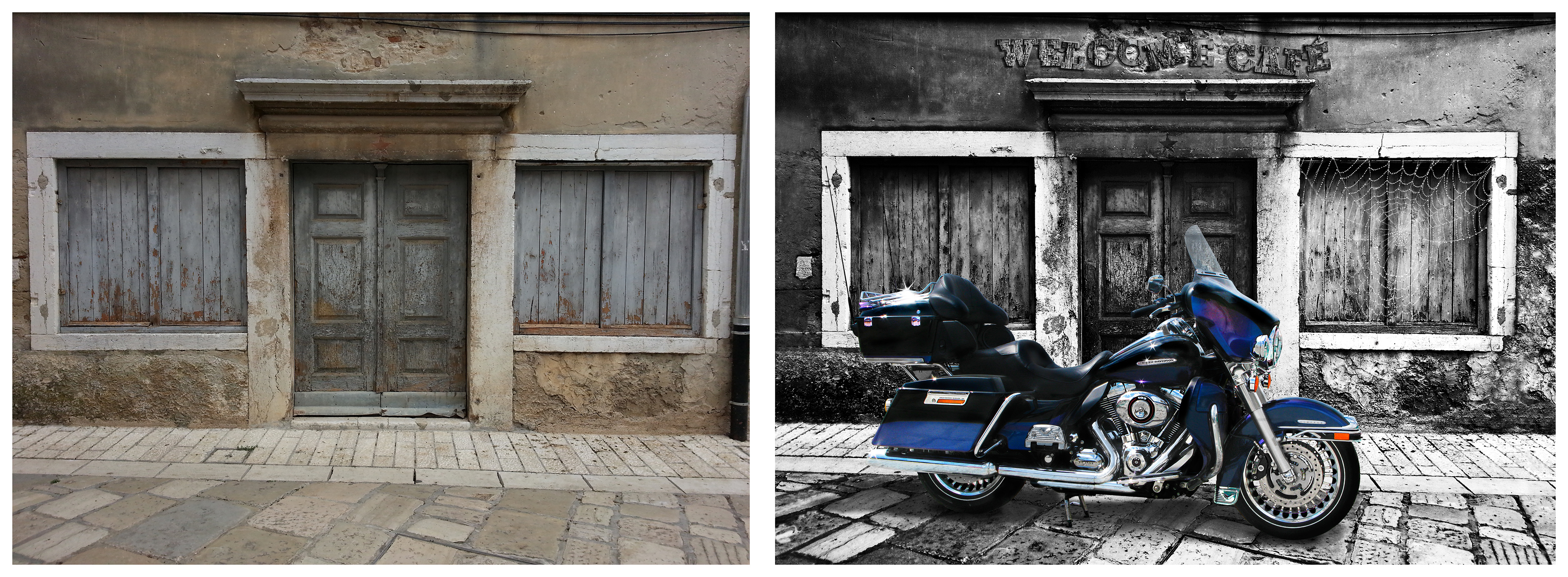 The decrepit building was photographed in Porec, Croatia. The Harley was photographed in Switzerland. Look closely and you will see my hand sketched cobweb, and Welcome sign above. I think it looks great with the background in Black & White.